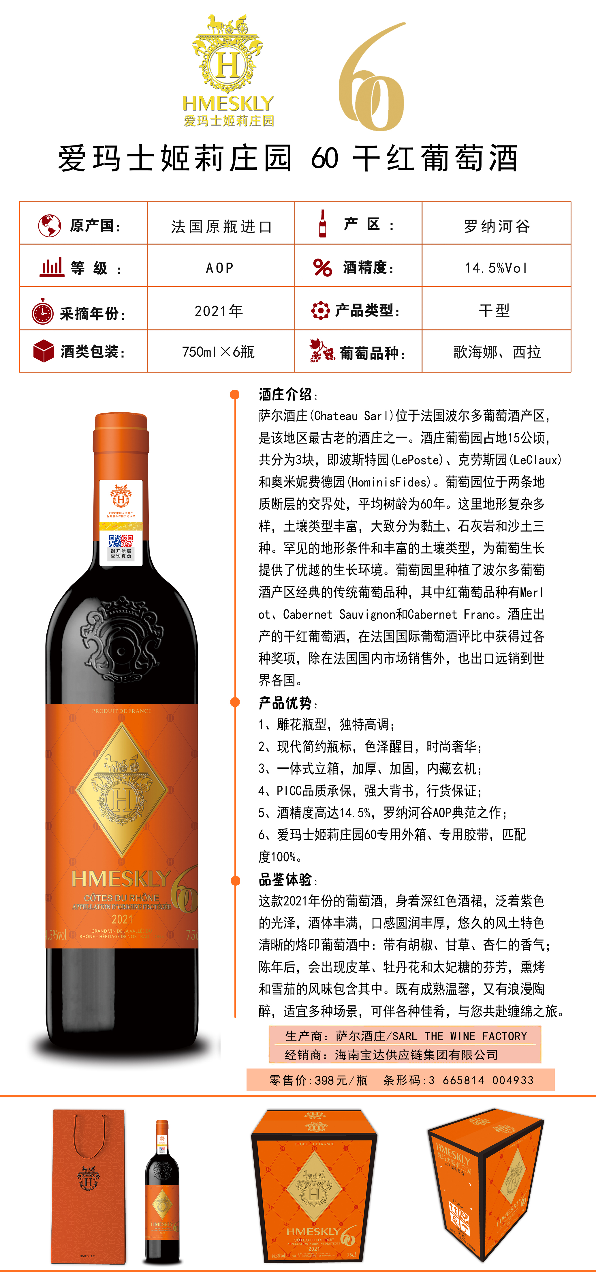法国爱玛士姬莉庄园60干红葡萄酒(一箱6瓶)
